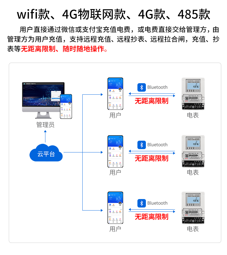 b. 智能電表內(nèi)置通信模塊,通過網(wǎng)絡與物業(yè)或房東連接,定期將用電數(shù)據(jù)傳輸?shù)轿飿I(yè)或房東數(shù)據(jù)庫中。